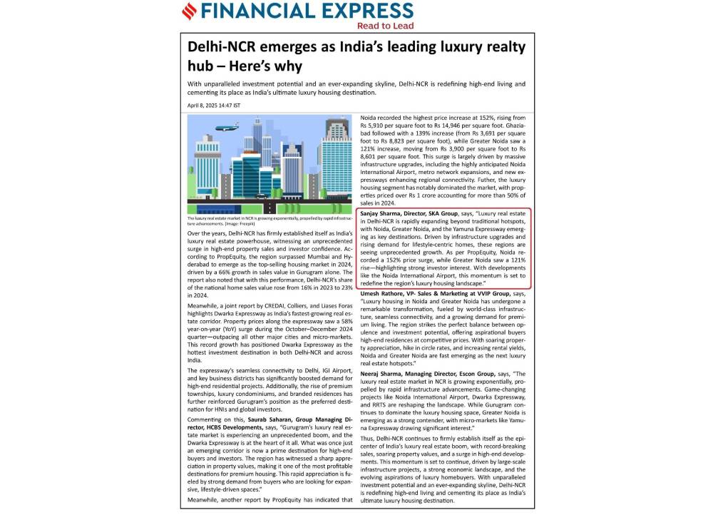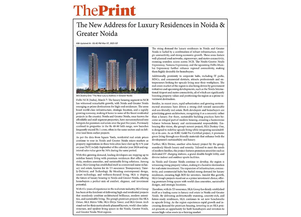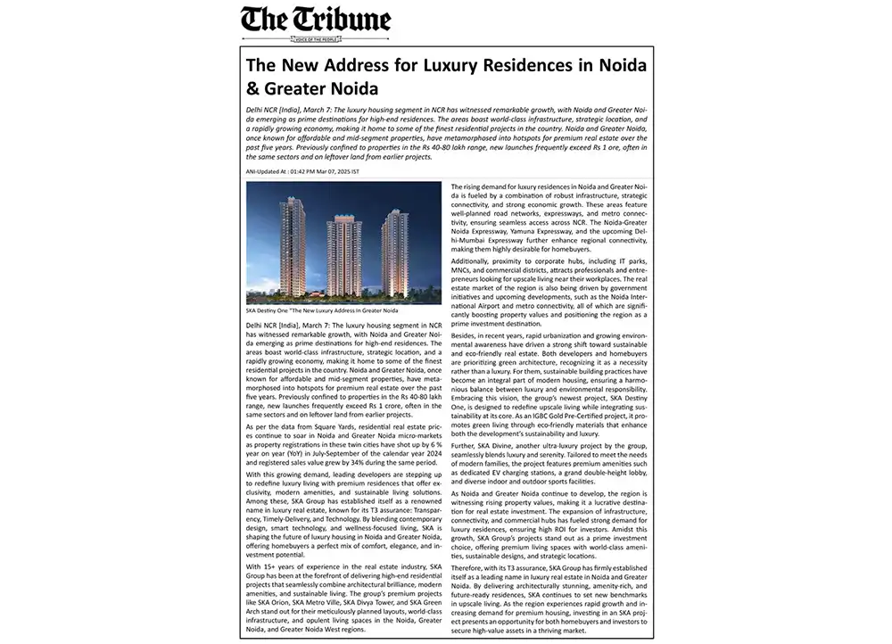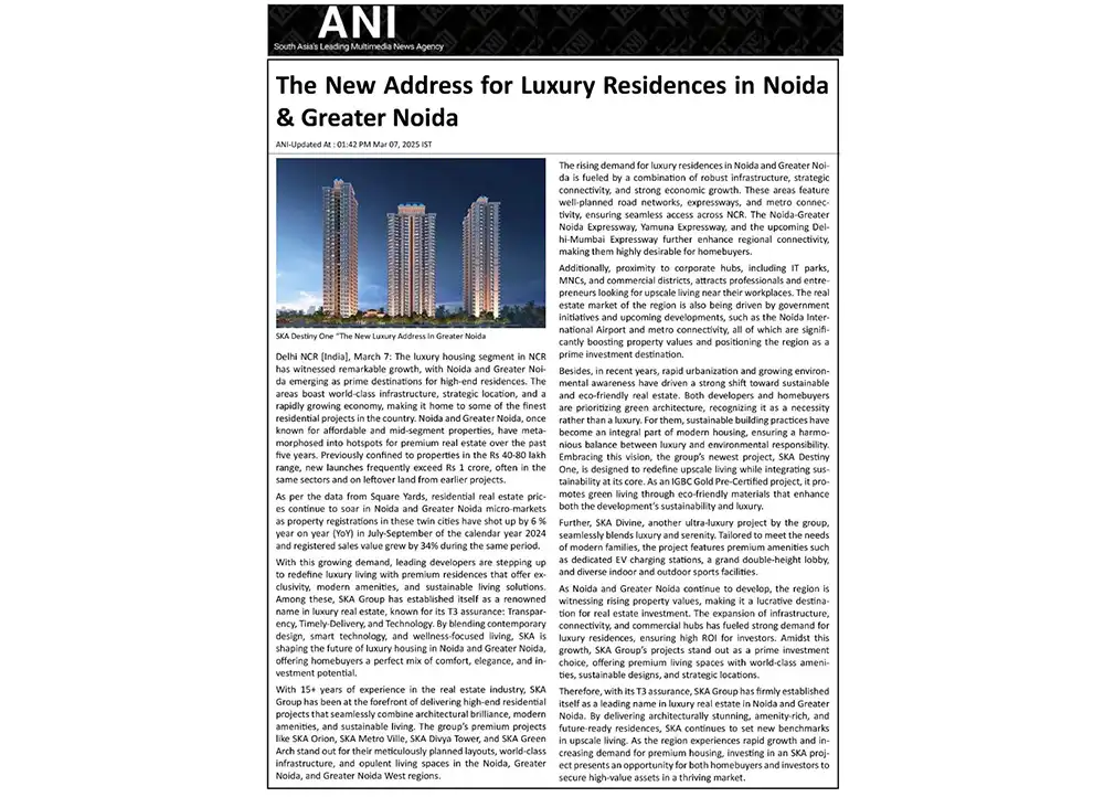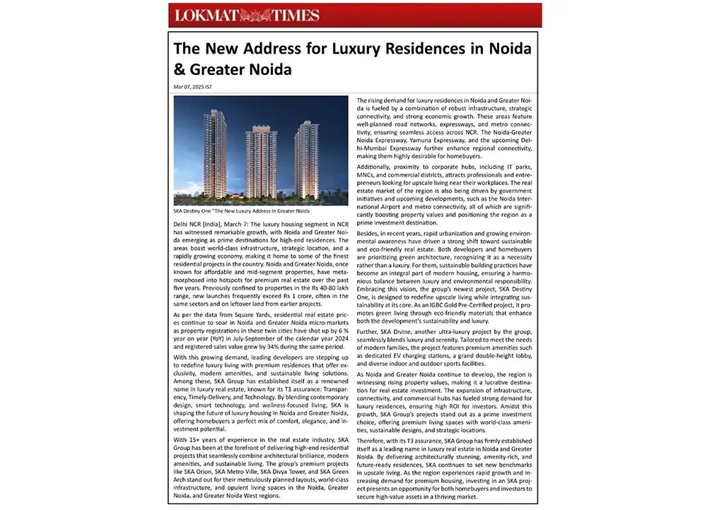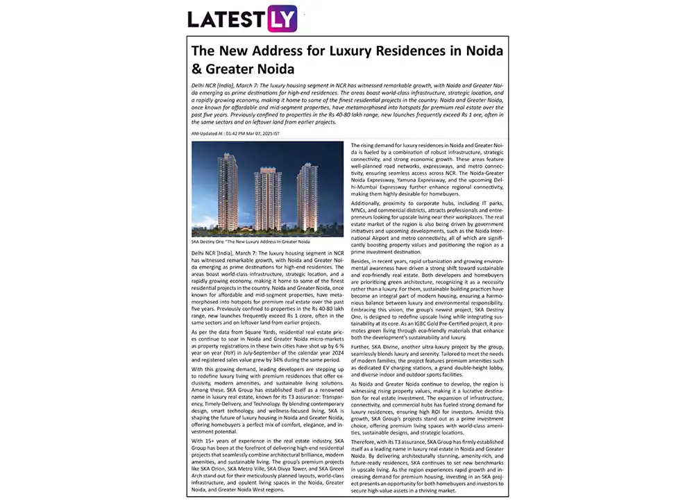 We have not initiated any new developments beyond the projects mentioned on our website, nor have we authorized any third parties to promote unlisted projects. Any recent advertisements or promotions on digital and social media regarding a new SKA GROUP PROJECT IN GREATER NOIDA are unauthorized and not associated with us in any way. We hold no responsibility for the accuracy of such claims.